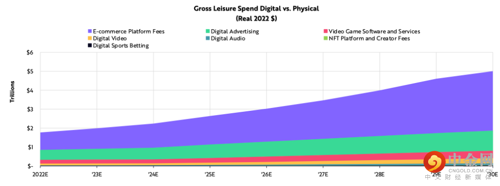 ARK在报告中指出,2022年,数字休闲支出总额为6.6万亿美元,预计在接下来的八年里,将以17%的年复合增长率增长至22.5万亿美元