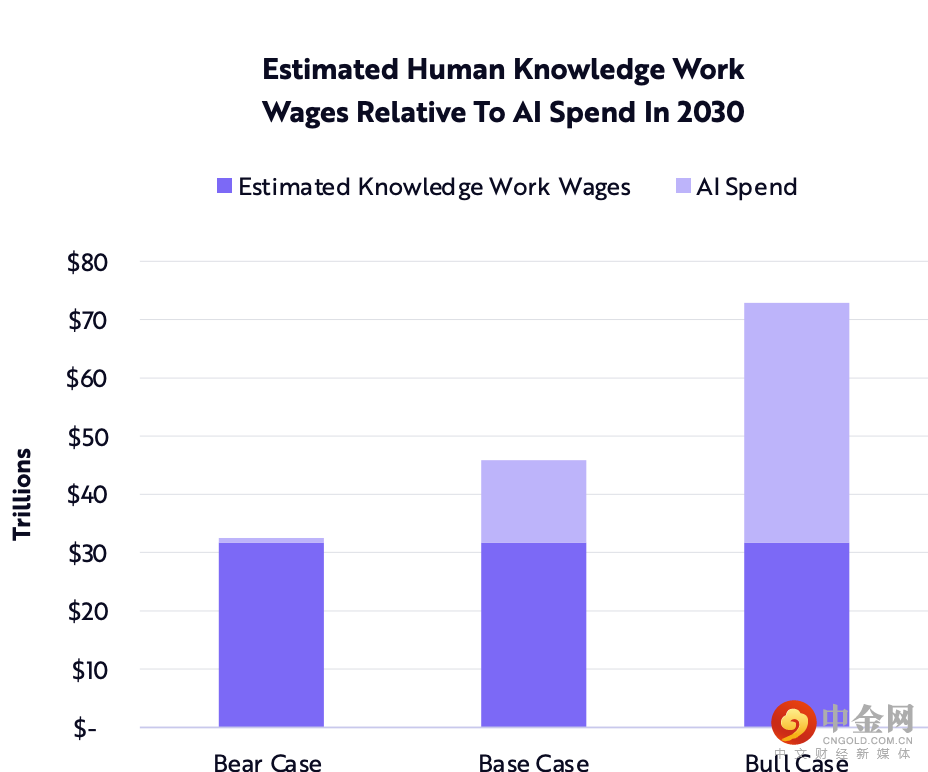 从提高知识工作者的生产力来看,根据ARK的研究,到2030年人工智能应该使知识工作者的生产力提高4倍以上。在100%采用人工智能的情况下,全球总支出约为41万亿美元,其创造的额外生产力约为200万亿美元: