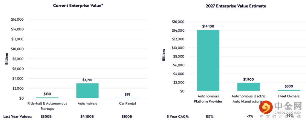 8.自动驾驶出租车或将在2027年产生4万亿美元的收入,创造14万亿美元的企业价值。此外,自主平台供应商企业价值将高速增长,预计年复合增长率达137%,从2022年的1.3亿美元涨至2027年的141亿美元。