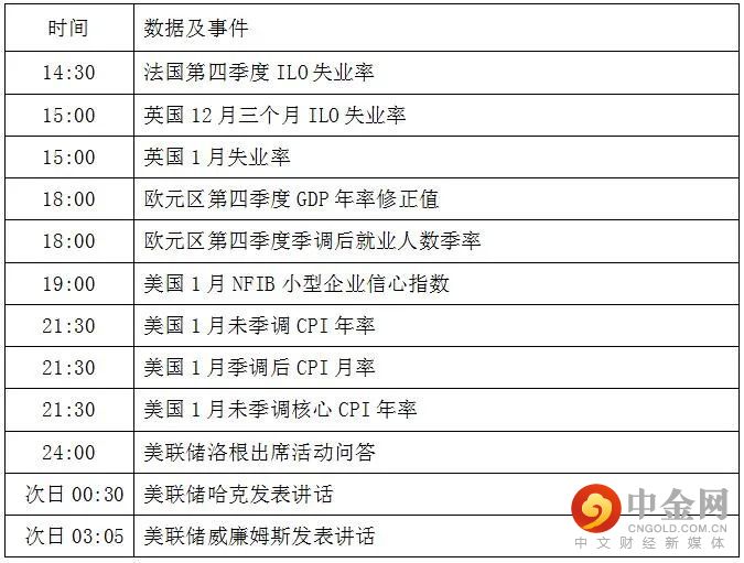 次日凌晨0点,达拉斯联储主席洛根将出席活动问答,他也是CPI数据公布后第一位发表讲话的官员,留意其对美国1月CPI数据的看法。次日凌晨0点30分,以及凌晨3点05分,费城联储主席哈克和纽约联储主席、FOMC常任票委威廉姆斯将发表讲话,需留意他们对CPI数据的看法以及他们的终端利率预期。