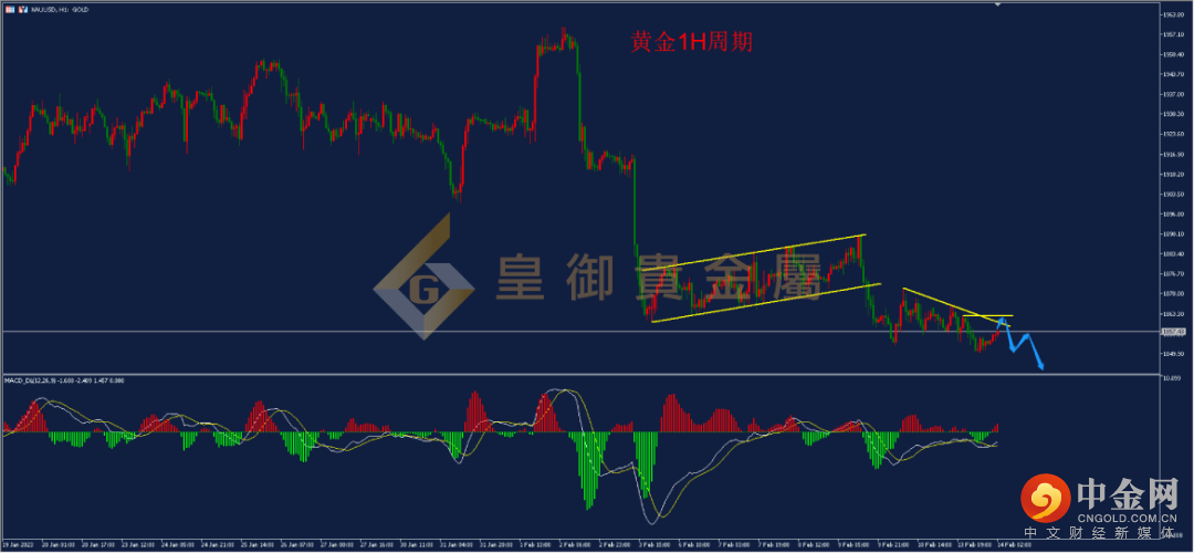 从下图的黄金1H周期图来看,黄金顶部形态确立后延续下跌趋势不变。局部目前行情时间换空间走出一个下倾式形态,高点不断降低,低点不断创新低,缓慢震荡下行的形式,空头趋势依然延续。从MACD指标上来看,快慢线跌破0轴空头主导行情,目前反抽0轴压力位,若快慢线0轴下形成死叉信号,空头有望开启新的下跌浪。日内操作建议关注形态下降趋势线附近压力位,建议反弹做空为主思路。