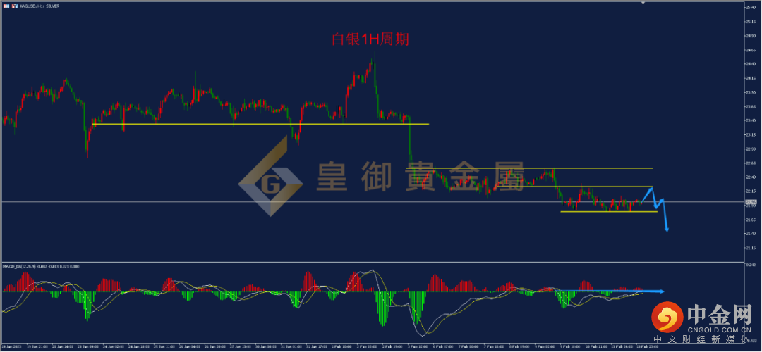 从下图白银1H周期图来看,白银高位头肩顶部形态确立后,价格延续下跌趋势行情不变,局部反弹构建了宽幅箱体形态,从盘面上看二个次级别宽幅震荡形态重心不断降低,而且小时图反弹高点不断降低,表示价格延续弱势空头趋势不变。结合MACD指标看,快慢线反弹0轴压力位,若0轴下方形成死叉信号出现,空头有望开启新低主跌浪。日内操作建议以逢高做空为主,可于上方关键压力22.15博弈空单操作。