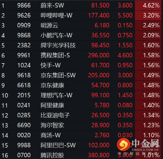 新能源车企领涨,蔚来涨近5%,小鹏涨超2%;哔哩哔哩、携程、快手等涨幅居前。