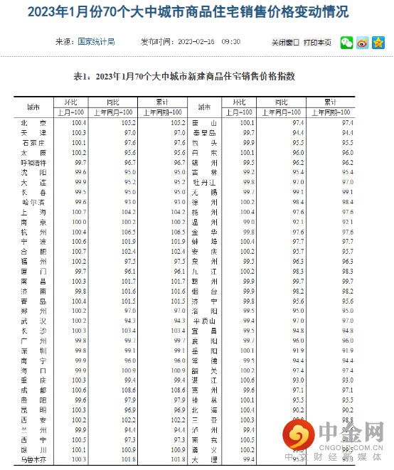 2月16日,国家统计局最新公布的2023年1月份商品住宅销售价格变动情况统计数据——