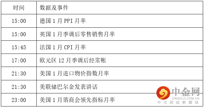 今日晚间将公布美国1月进口物价指数及谘商会领先指标月率,考虑到近期美国经济数据表现强劲,晚间数据利空黄金的概率增大;此外,美联储巴尔金将发表讲话,若再度释放鹰派观点,则金价再度下行的风险增大,投资者需密切关注具体数据及消息对行情产生的影响,把握盘中交易机会!