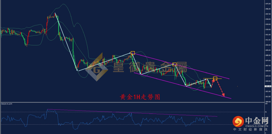 从下图的黄金1H周期图来看,金价自1959高点回落以来,呈现高低点逐步下移的看空形态,且自1890开始维持在震荡下行的通道内运行,整体趋势线依然看空,考虑到布林带三轨走平,可以耐心等待价格反弹到布林上轨高空为主,上方1845-1850区域可以做为今日较好的做空区域,该区域为布林上轨与下降通道上轨构成的压力区域,下方关注1815附近的通道下轨支撑。结合RSI指标来看,RSI呈现高点逐步下移的看空形态,且指标受到高点连成的压力线的压制,原则上,在上破压力线之前,RSI再度向下测试30.0的概率增大。日内可以等待价格反弹1845的布林上轨压力附近,尝试做空。