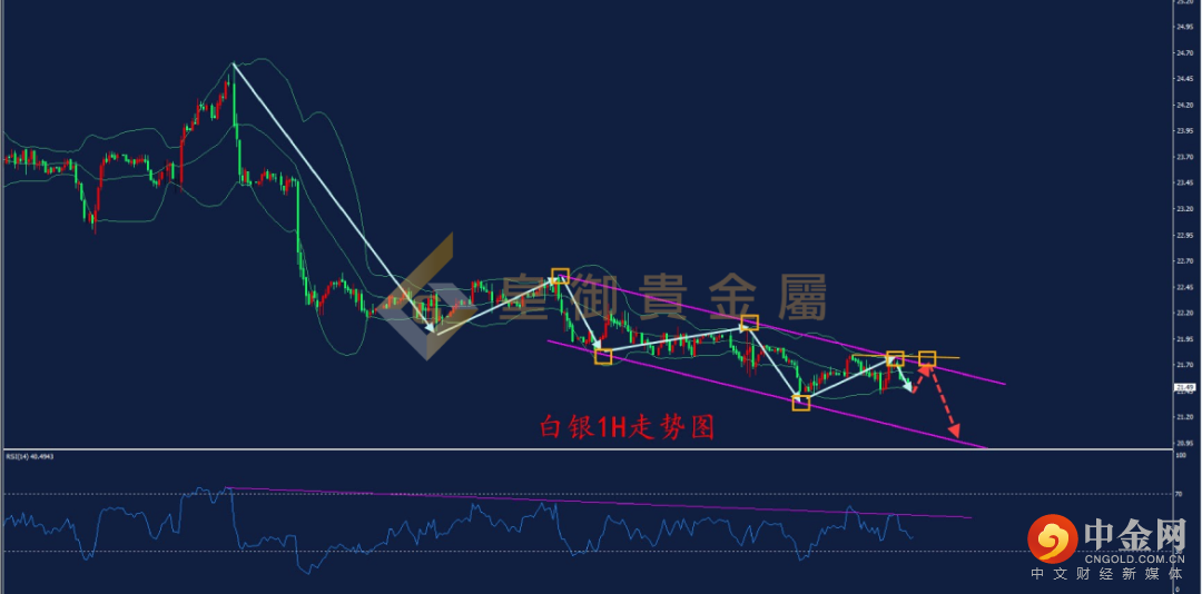 从下图白银1H周期图来看,白银自24.62高点回落以来,呈现高低点逐步下移的看空形态,且自22.57开始维持在震荡下行的通道内运行,大方向依然看空,考虑到布林带三轨走平,表明价格反弹至21.75的布林上轨附近的概率增大,该位置同时也是通道上轨附近的压力,可以作为今日较好的空单入场点,下方关注21.00整数附近的支撑,该位置同时也是通道下轨的支撑。结合RSI指标来看,RSI自70.0上方回落以来,呈现高点逐步下移的下降走势,上方高点连成的压力线对指标形成压力,上破之前,继续维持向下运行的概率增大。日内可以等待价格反弹21.75的布林上轨压力附近,尝试做空。