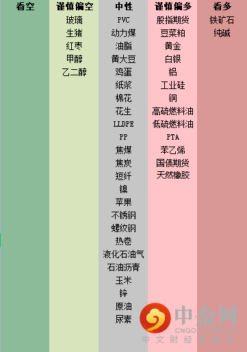商品期货:黑色建材、农产品(豆菜粕、玉米)谨慎偏多;贵金属、有色金属、原油链条商品中性;