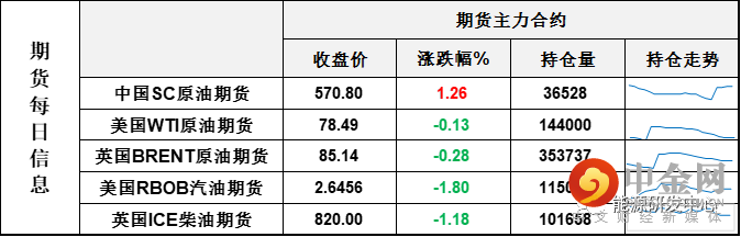 【1】WTI主力原油期货收跌0.1美元,跌幅0.13%,报78.49美元/桶;布伦特主力原油期货收跌0.24美元,跌幅0.28%,报85.14美元/桶;INE原油期货收涨1.26%,报570.8元。