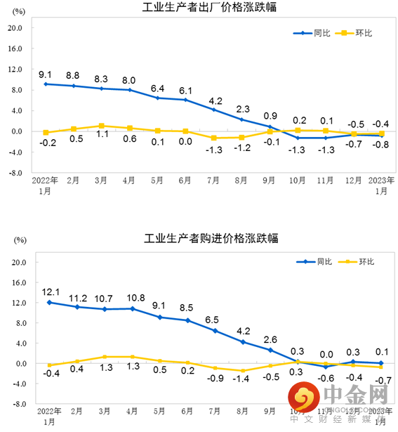 2023年1月份,全国工业生产者出厂价格同比下降0.8%,环比下降0.4%;工业生产者购进价格同比上涨0.1%,环比下降0.7%。
