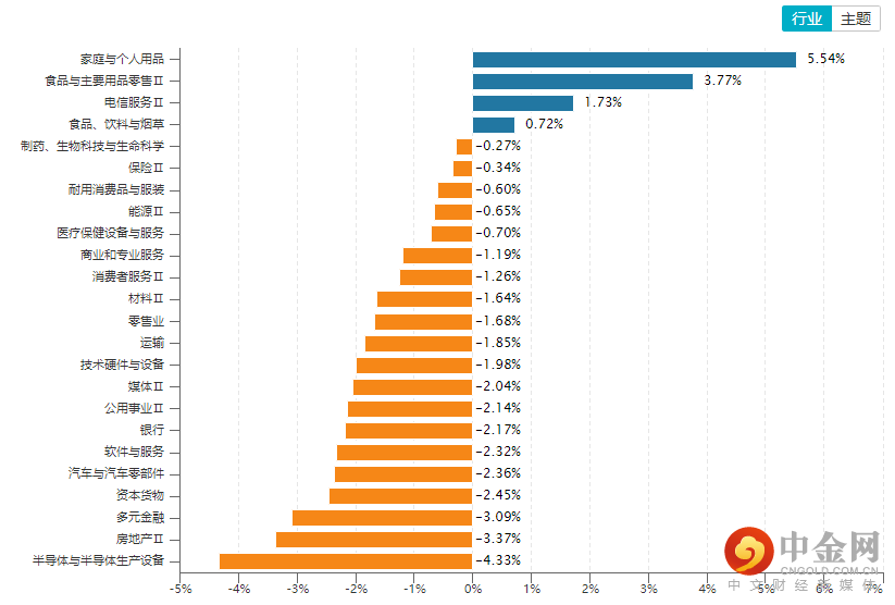 从行业板块表现来看,大部分行业收跌,半导体、房地产、多元金融等板块跌幅居前,全周仅家庭与个人用品、食品与主要用品零售、电信服务、食品饮料四个板块录得一定涨幅。