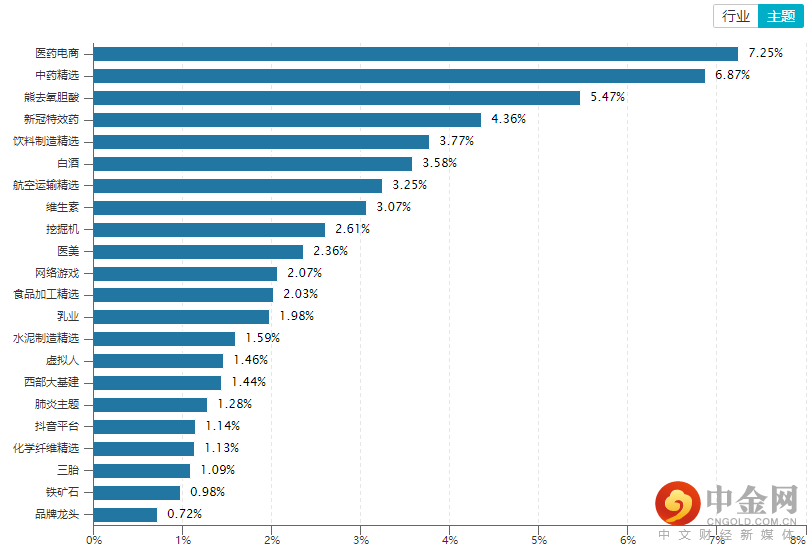从概念主题板块的表现看,医药电商、中药、新冠药方向等涨幅居前,品牌龙头、铁矿石、三胎等涨幅相对落后。
