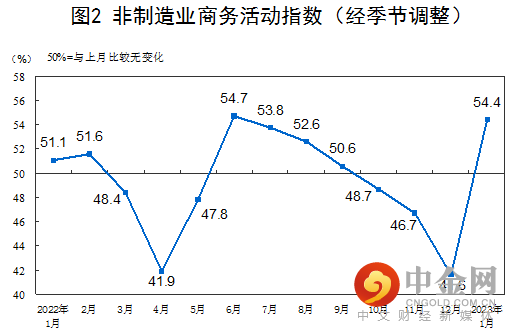 1月份,非制造业商务活动指数为54.4%,比上月上升12.8个百分点,高于临界点,非制造业景气水平触底回升。