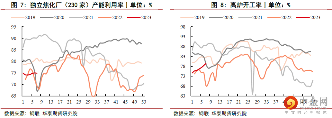 从供给端看:本周Mysteel统计独立焦企全样本:产能利用率为72.3%减0.1%;焦炭日均产量66.7万吨,增0.2万吨,焦炭库存122.5万吨,减2.8万吨,炼焦煤总库存958.9万吨,减12.4万吨,焦煤可用天数10.8天,减0.2天。本周独立焦化厂库存微降,产能利用率保持稳定。