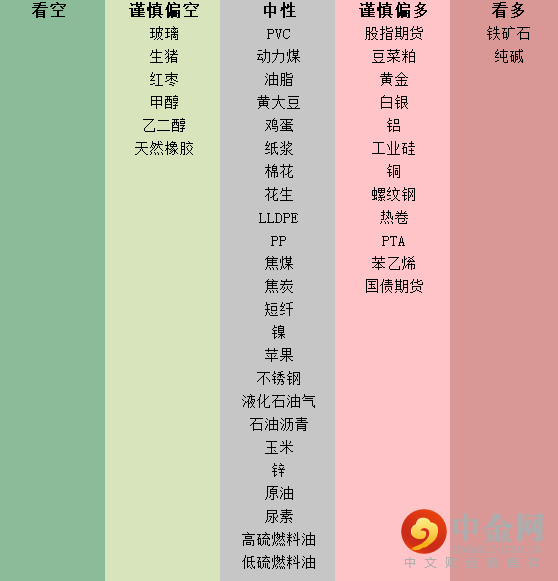 商品期货:黑色建材、农产品(豆菜粕、玉米)谨慎偏多;贵金属、有色金属、原油链条商品中性。