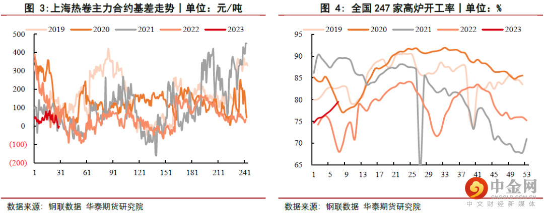 本周螺纹主力合约2305震荡上行,收于4167元/吨,上涨109元/吨,环比上涨2.69%,热卷主力合约2305延续涨势,收于4240元/吨,上涨99元/吨,环比上涨2.39%,本周现货市场钢价稳中有升。