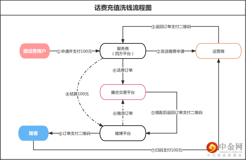5.服务商将收取的话费定期结算给赌博平台,完成整个洗钱流程。