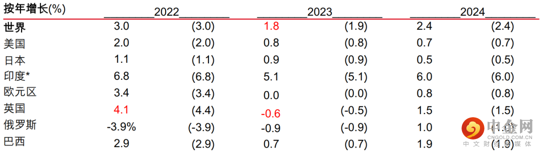 注:*为便于比较,印度数据为日历年度预测。此前预测在括号中显示,来自 2023年 1 月 3 日的宏观月刊。绿色表示上调,红色表示下调。