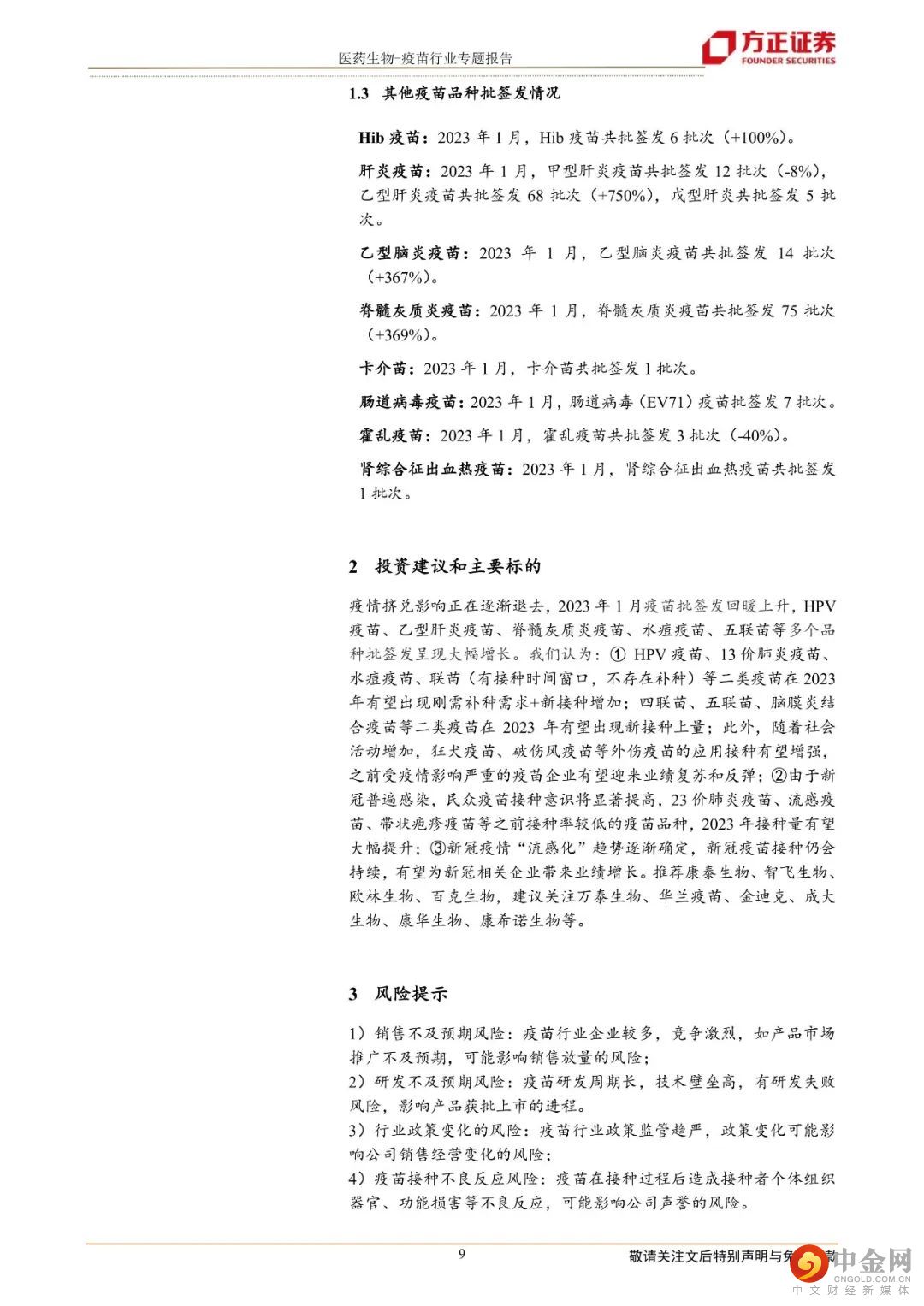 投资建议:疫情挤兑影响正在逐渐退去,2023年1月疫苗批签发批次回暖,HPV疫苗、乙型肝炎疫苗、脊髓灰质炎疫苗、水痘疫苗、五联苗等多个重要品种批签发呈现大幅增长。我们认为:① HPV疫苗、13价肺炎疫苗、水痘疫苗等二类疫苗在2023年有望出现刚需补种需求;四联苗、五联苗、脑膜炎结合疫苗等二类疫苗在2023年有望出现新接种上量;此外,随着社会活动增加,狂犬疫苗、破伤风疫苗等外伤疫苗的接种有望增强,原受疫情影响严重的疫苗企业有望迎来业绩复苏和反弹;②由于新冠普遍感染,民众疫苗接种意识将显著提高,23价肺炎疫苗、流感疫苗、带状疱疹疫苗等之前接种率较低的疫苗品种,2023年接种量有望大幅提升;③新冠疫情“流感化”趋势逐渐确定,新冠疫苗接种仍会持续,有望为新冠相关企业带来业绩增长。推荐康泰生物、智飞生物、欧林生物、百克生物,建议关注万泰生物、华兰疫苗、金迪克、成大生物、康华生物、康希诺生物等。