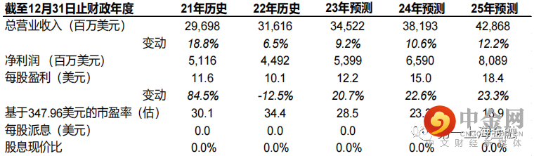 考虑到汇兑影响、海外需求可能持续放缓,下调 23-25 年收入至 345/382/429 亿美元,同比增长 9%/11%/12%;上调经营利润率至 19%/21%/22%,净利率 16%/17%/19%。采用DCF 法估值,求得目标价 430.00 美元,对应 2023-2025 年 PE 分别为 35/29/23倍,较当前股价有 23.6% 的上升空间,维持买入评级。