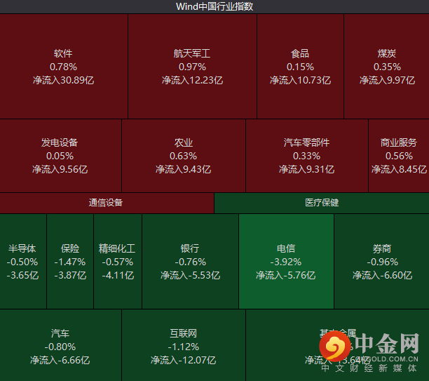 行业板块方面,软件、航天军工、食品、煤炭等呈现净流入态势,基本金属、互联网、汽车等内容资金净流出。