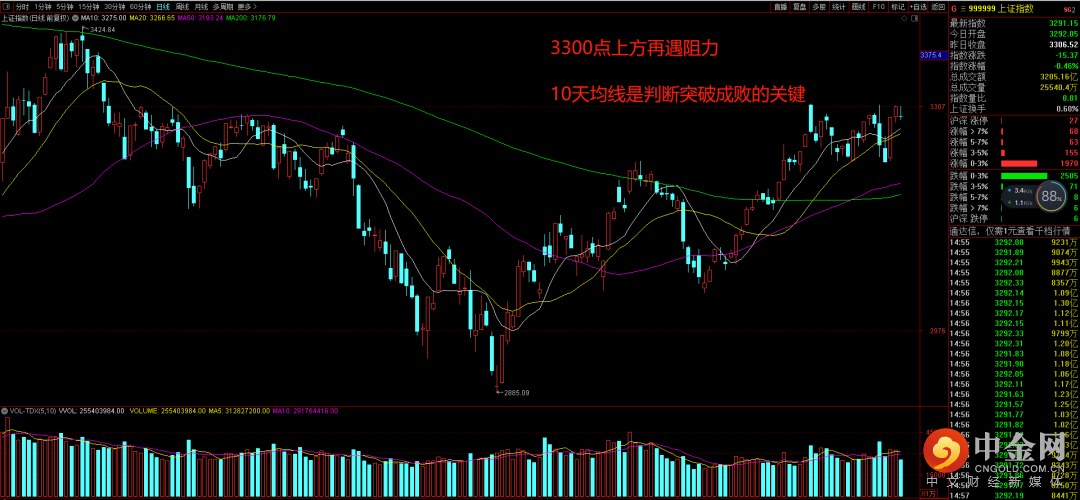 从积极层面而言,市场在突破前的主动蓄力。消极层面而言,是市场强度不够。后续来看,我们主要通过10天均线的防守力度对该情况进行判断,10天线若能企稳,市场反弹突破的进程仍将延续。