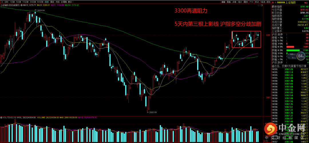 沪指持续在3300附近遇阻,近5个交易日出现3个上影线走势,说明市场多空双方分歧情绪进一步加剧。通常而言,分歧加剧的背后往往是距离市场方向选择越来越临近。