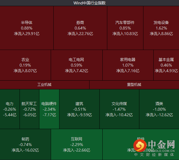 行业板块方面,半导体、券商、汽车零部件等呈现净流入态势,软件、互联网、制药等内容资金净流出。
