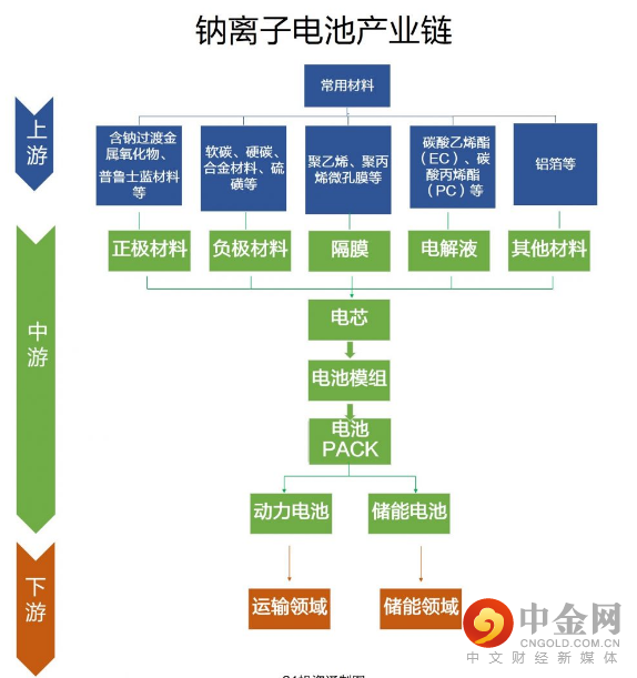 从产业链来看,钠离子电池与锂电的产业链较为相似,主要由正极、负极、隔膜和电解液组成,两者的生产设备基本可实现兼容。上游端产业主要涉及电池制备的原材料,中游涉及正负极材料、电解液、隔膜的制备以及电池整体制造,产业下游的应用场景主要分动力和储能两大领域。