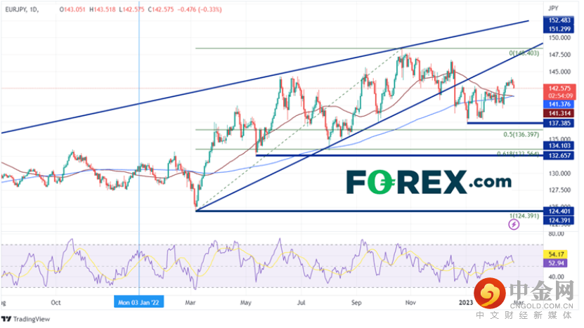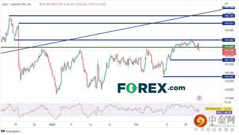 在240分钟图上,可以看出143.00一直是重要的点位,因为它近期既是阻力位又是支撑位。如果价格在周五事件后继续走低,第一个支撑位在141.31和141.38之间的50日和200日移动平均线交汇处(见日线图)。跌破该区域,价格可能会跌至2月13日以来的低点141.52,然后是2月10日的低点139.55。然而,如果CPI走弱或植田比预期“更鸽派”,欧元/日元可能会走高。第一阻力位是2月21日创下的2023年高点144.16。在此之上,价格可能会移动到2022年12月20日高点145.83,然后是2022年12月15日高点146.72。