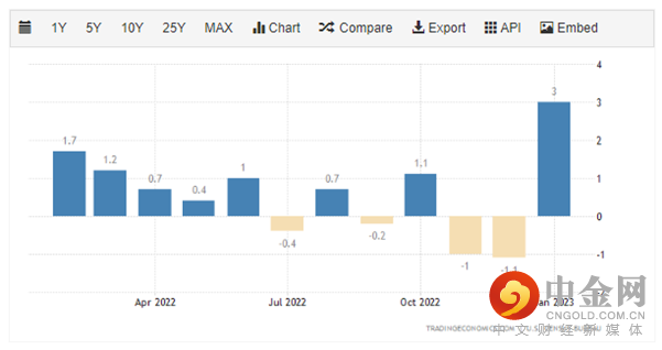 4. 美国1月零售数据大涨至3.0%(前值为-1.1%);