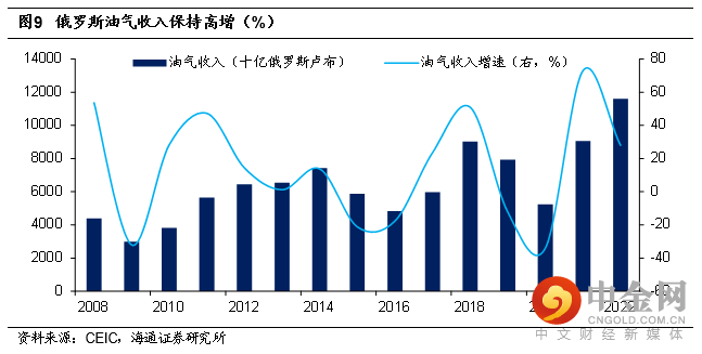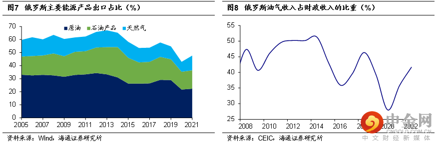从财政角度来看,油气收入是俄罗斯财政收入的主要来源,2011-2014年期间,油气收入占俄罗斯财政收入的比重高达5成以上;此后虽有下滑,也在4成左右(除2020年)。在俄乌地缘事件发生后,俄罗斯经贸及金融领域受到较多限制,财政更加依赖于油气收入。截至2022年,俄罗斯油气收入占财政收入的比重上行至41.6%,较2021年上行约6个百分点。