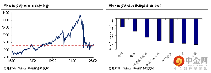 俄罗斯股市大跌。俄乌地缘事件发生后,俄罗斯股市大幅下跌,事件发生后10天左右,俄罗斯MOEX指数跌幅超过40%,且2022年2月俄罗斯RTS指数较1月下跌34.7%。分行业来看,金融和能源板块受冲击最大,跌幅均接近40%。这很大程度上与俄罗斯面临的经贸、金融制裁有关。