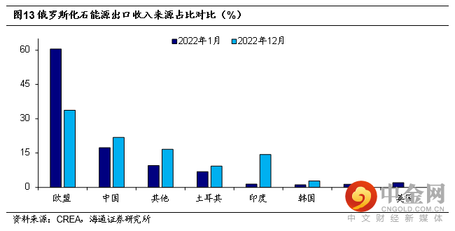 此外,俄罗斯积极拓展了其他买家,尤其是印度等其它新兴市场。从能源出口收入来看,截至2022年12月,俄罗斯输送到欧盟的能源收入较年初下降了约50%,而向印度、土耳其以及中国输送的能源收入均明显上升,尤其是输送到印度的能源收入提升了1000多倍。