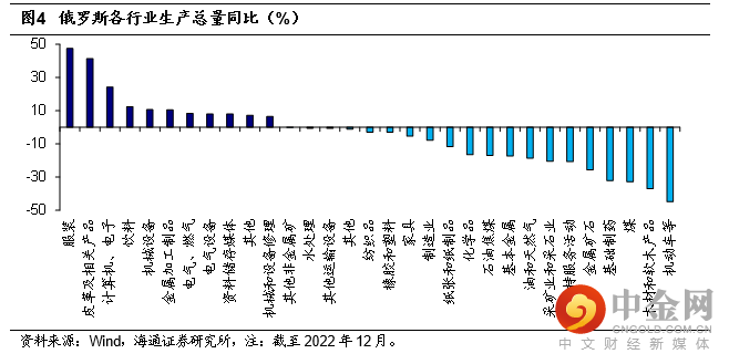 分行业来看,分化较明显。截至2022年12月,煤、基础制药、金属矿石、木材和软木产品、机动车等行业生产跌幅最大,平均跌幅接近40%;化学品、油和天然气以及石油焦煤等行业生产跌幅也超过10%。而服装、皮革及相关产品等行业生产平均涨幅接近40%,烟草、饮料、食品、机械与电气设备等行业生产也有较好的表现,平均涨幅在10%左右。我们认为,这很大程度上是与海外主要经济体对俄罗斯的经贸制裁以及地缘事件持续有关。