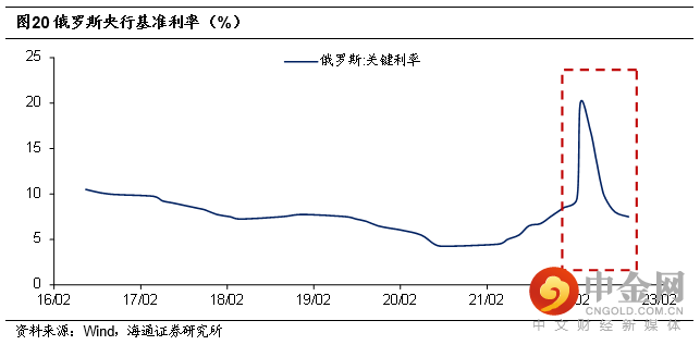 卢布为何反而升值?其一,与俄罗斯大幅加息有关。在2022年2月底,俄罗斯央行将基准利率从9.5%大幅上提至20%,市场化的存贷款利率也同步大幅上行。