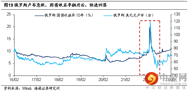 俄罗斯卢布急贬后升值。俄乌地缘事件发生后,俄罗斯国债收益率大幅飙升,从冲突前不足10%上行至接近20%,上行了1000多BP。卢布也急速贬值,从冲突前75(美元兑卢布)附近贬值到120以上,贬值了近40%。