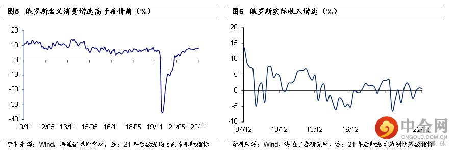 若剔除通胀影响,俄罗斯实际收入增速一度陷入了负区间,实际消费增速在去年2季度和3季度也均处于负区间,为2016年以来首次(不考虑疫情期间)。
