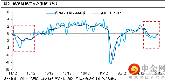 受战争以及经济金融制裁等影响,俄罗斯经济再度萎靡。俄罗斯实际GDP增速自2016年底以来持续维持正增长,2016年至2019年平均增速能达到2.0%左右。在2022年3月之前,俄罗斯实际GDP增速也能保持正增长,即使剔除基数影响,也是如此。