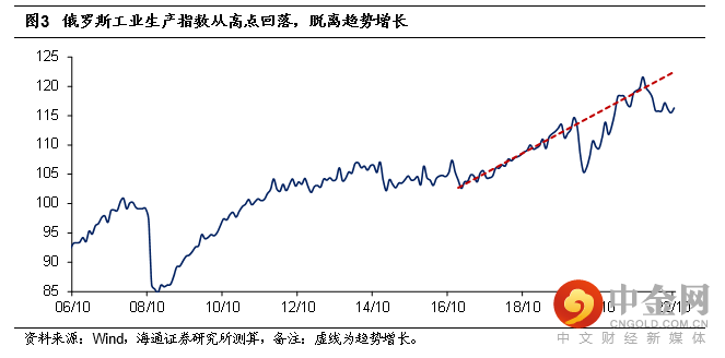 从生产方面来看,自俄乌地缘风险爆发后,俄罗斯工业生产从之前的高点快速回落,实际工业生产同比从2022年4月开始转负,截至2022年12月,已经连续9个月为负。