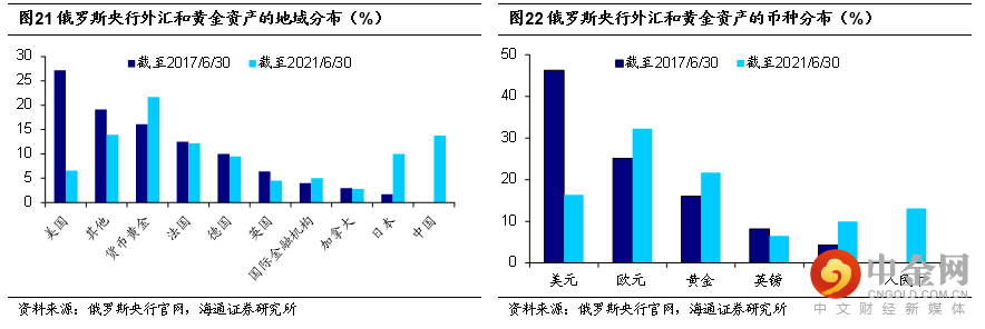 此外,自2014年受SWIFT剔除风险后,俄罗斯便采取了一些防御的措施,也有助于汇率的稳定。例如,俄罗斯不断增加黄金储备,同时减少在美资产。截至2021年6月,俄罗斯央行外汇和黄金资产在美比重从2017年6月的27.2%大幅降至6.6%。同时,俄罗斯也加速“去美元化”。截至2020年,俄罗斯商品和服务出口以美元结算的比重从之前的8成左右降至5成多;截至2021年6月,俄罗斯央行外汇和黄金资产以美元计价的比重从2017年6月的4成多降至不到2成。