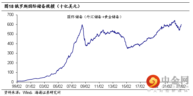 俄罗斯国际储备明显减少。俄罗斯国际储备(包含外汇储备和黄金储备)明显下滑,在2022年10月达到低点,较俄乌冲突发生前减少了1000多亿美元。尽管从去年11月开始,俄罗斯国际储备有所回升,但过去一年依然减少了400多亿美元。此外,根据俄罗斯财政部长安东·西卢安诺夫发言,俄罗斯约3000亿美元的国际储备被冻结,约占总国际储备的5成左右。