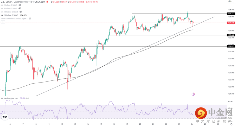 汇价在数据公布后短线下探134.30一线,不过这里有2月趋势线和均线的初步支撑。若跌破则需要关注133.70/90以及133等位置。
