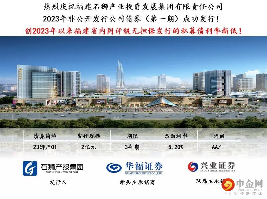 2023年3月2日,福建石狮产业投资发展集团有限责任公司2023年面向专业投资者非公开发行公司债券(第一期)(以下简称“23狮产01”)成功发行,债券规模为2亿元,期限为3年期,票面利率为5.20%,华福证券为本期债券的牵头主承销商。