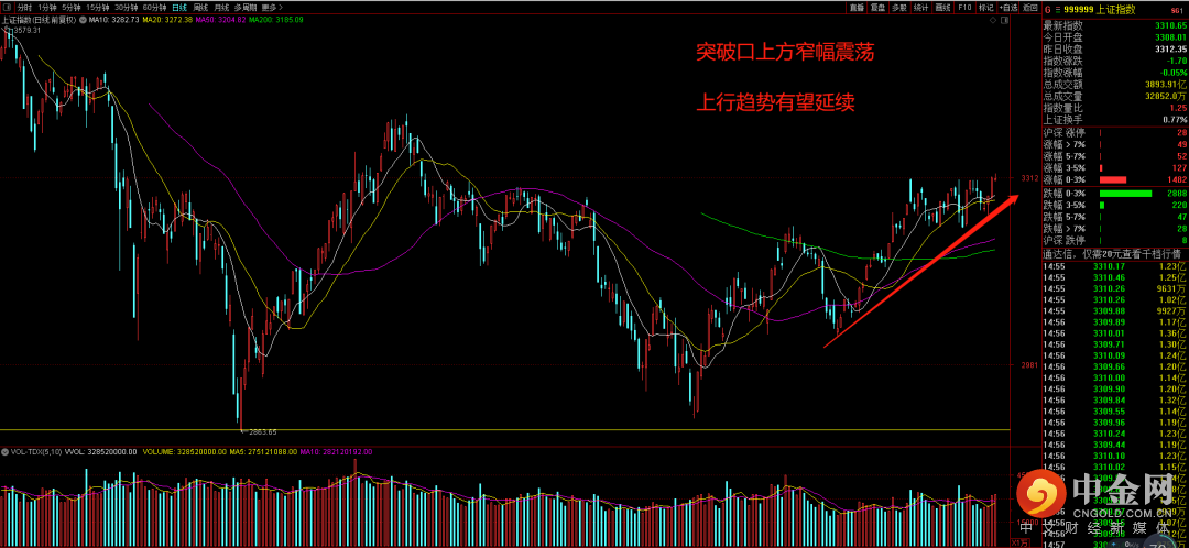 沪指在成功站上3300点上方后,昨日呈现出窄幅震荡态势。市场虽然出现略有放量的上影线,但有效收在突破口上方。目前依然延续在反弹趋势线上方,整体来看市场处在良性运转趋势之中。