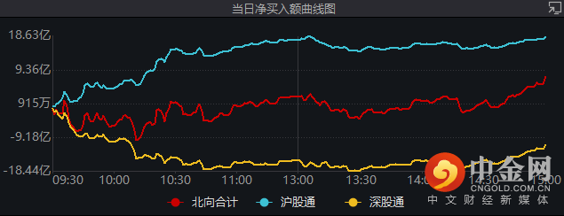净买入额曲线图来看,沪股通与深股通的北向资金数据呈现分化,沪股通全天维持净流入,而深股通方面则流出趋势明显。