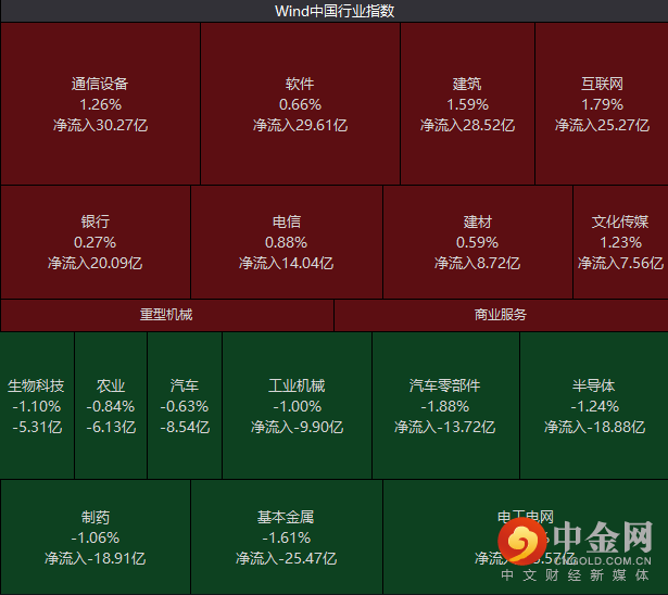 行业板块方面,通信设备、软件、建筑、互联网等呈现净流入态势,电工电网、基本金属、制药等内容资金净流出。