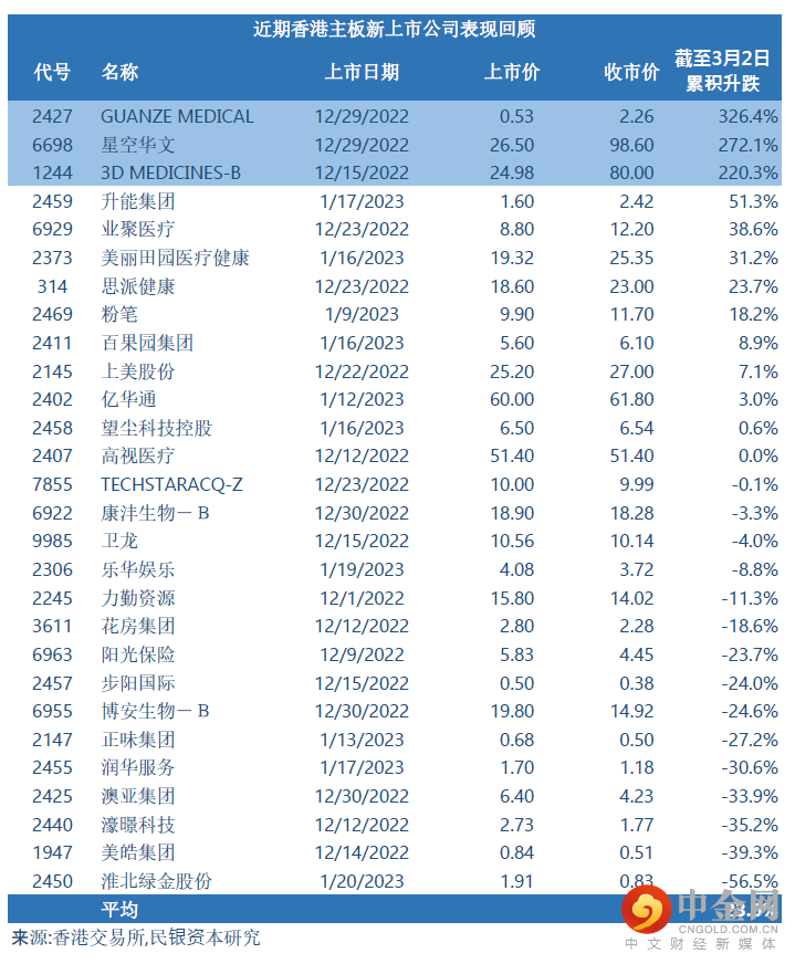 期内表现最佳3只新股份别是Guanze Medical(2427 HK)、星空华文(6698 HK)和3D Medicines (1244 HK),累计分别上升326.4%、272.1%及220.3%。Guanze Medical是一家立足于山东省的医学影像解决方案供货商,主要从事提供医用影像胶片产品及医学影像云服务。就医用影像胶片产品业务而言,集团从事分销采购自国际品牌的医用影像胶片产品及销售自家品牌的医用影像胶片产品。医用影像胶片产品业务分部占集团大部分收益。就分销业务而言,集团是一家总部位于美国医学影像产品生产商的在山东省的二级分销商。星空华文是中国最大综艺节目IP创造商及运营商,按2021年收入计,市场份额为1.6%。集团由下列四个业务分部组成:综艺节目IP制作、运营及授权;音乐IP运营及授权;电影及剧集IP运营及授权;及其他IP相关业务。星空华文亦拥有及运营庞大的中国电影IP库,也是中国音乐IP创造商及运营商。3D Medicines是一家成立于2014年的生物医药公司,致力为长期治疗的患者研发肿瘤药物。核心业务模式是通过联合合作开发、许可引进及自主发现等方式,开发及商业化肿瘤产品及候选药物。截至2022年11月21日,集团已建立一条包含一款核心产品及11款候选药物的管线,其中核心产品恩沃利单抗(品牌名:恩维达®)为支柱产品,已于2021年11月获批并于2021年12月商业化,另有七款其他候选药物处于临床阶段。集团向药店运营公司及分销商销售恩沃利单抗产生收入,客户覆盖中国30个省及直辖市。集团正在江苏省徐州市建造内部生产设施,预计于2024年前完成设施的建造并投入运营。
