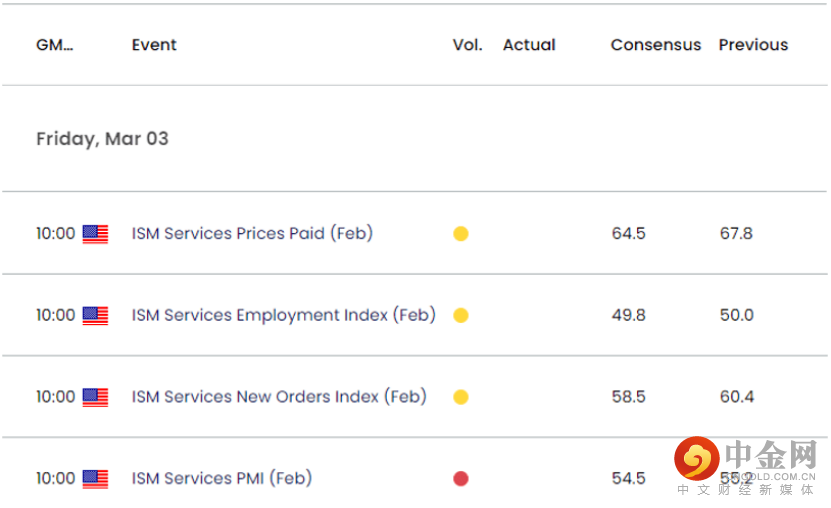 预计此次新发布的数据将显示ISM指数从1月份的55.2收窄至54.5,而低迷的前景可能会令美元/日元跌破移动平均线,因为它会对美联储结束加息周期的决定带来压力。