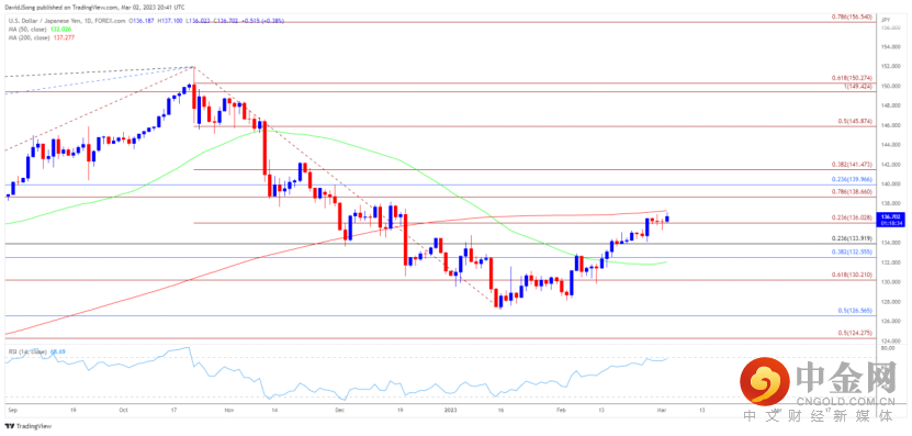 近期上涨的美元/日元逼近200日均线(137.28),相对强弱指数(RSI)自2022年10月以来首次处于超买区域的临界点。